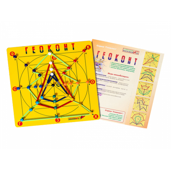 Игра "Геоконт" развивает сенсорику, мелкую моторику, логику, фантазию, учит силуэтному конструированию, совершенствует интеллект и развивает творческие и логические способности ребенка. Согласно определенным заданиям, ребенок натягивает резинки на гвоздики так, что создает предметные силуэты, геометрические фигуры, узоры, цифры, буквы - по образцу, словесному алгоритму и собственному замыслу.