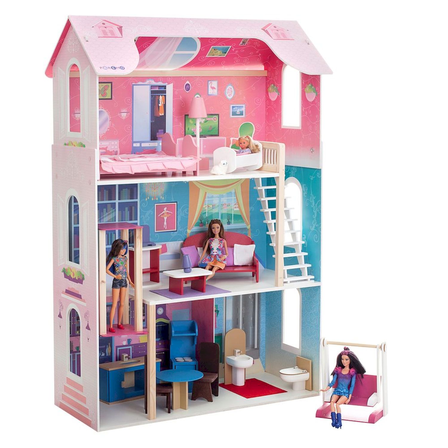 В наборе 16 предметов мебели и кукольные качели: раковина, унитаз (крышка поднимается), круглый обеденный стол, 2 классических стула завершают обеденную группу, кухонная плита (дверца духового шкафа открывается), кухонная мойка (боковые дверцы гарнитура открываются), диван, журнальный столик, открытый шкафчик, часы, настольная лампа, 2 большие кровати для Барби, колыбель для куколки-ребенка (до 15 см), торшер.