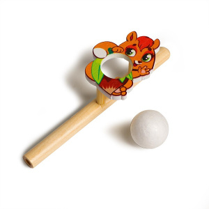 Тренажёр для дыхания выполнен из дерева. Играть с ним легко и просто: нужно положить пенопластовый шарик в отверстие, а затем дунуть со всей силы, чтобы шар подскочил в воздух.