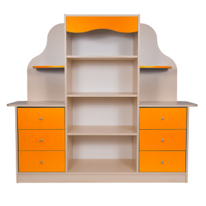 Все полки находятся в зоне доступа ребенка, подход к игровой зоне со всех сторон. Удобно для хранения игрушек, развивающих пособий и книг. Выдвижные ящики.