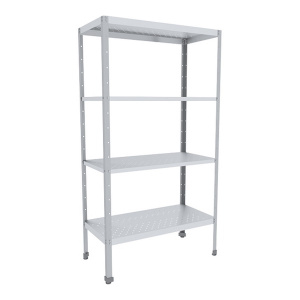 Полки перфорированные из нержавеющей марки стали AISI 430 толщиной 0,5 мм. Стойки стеллажа имеют крепежные отверстия для установки полок на любой необходимой высоте. Стеллаж имеет регулируемые по высоте ножки. Изделие поставляется в разобранном виде. Упаковка гофрокартон.
