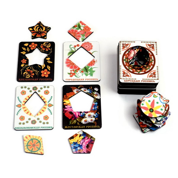 Развивающая игрушки представляет собой красочно оформленные деревянные пластины (20 штук) с пазами посередине, имеющими геометрическую форму (круг, квадрат, овал, трапеция). Необходим вложить ту геометрическую фигуру в паз пластины, которая походит по форме, размеру и соответствует общему рисунку.