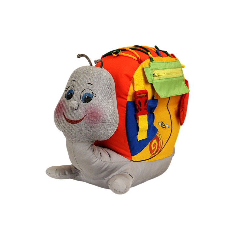 Улитка сшита из разноцветных сегментов, каждый из которых представляет какую-нибудь застежку: это и пуговицы, и молния, и шнуровка, и липучка.