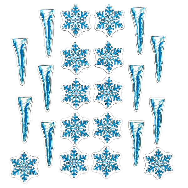 В наборе двадцать две магнитных карточки: 12 снежинок и 10 сосулек. Карточки гнутся и не ломаются, моются под краном.