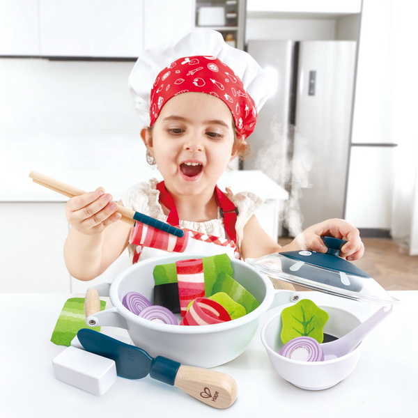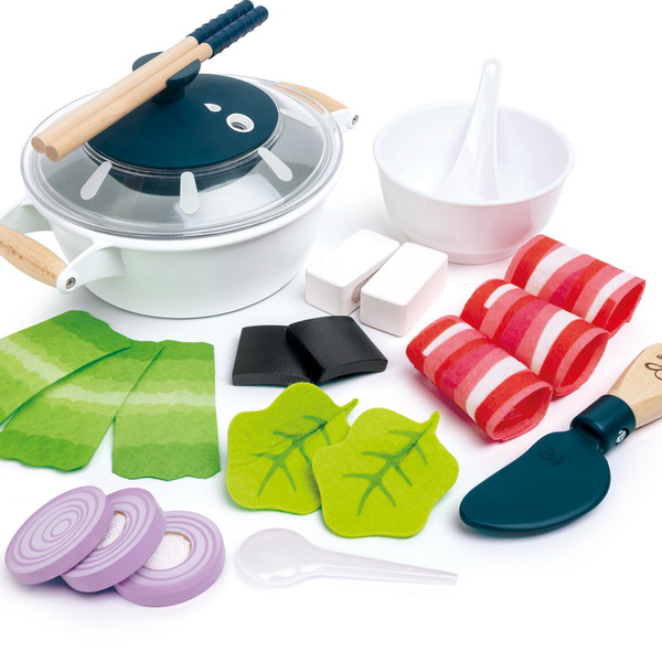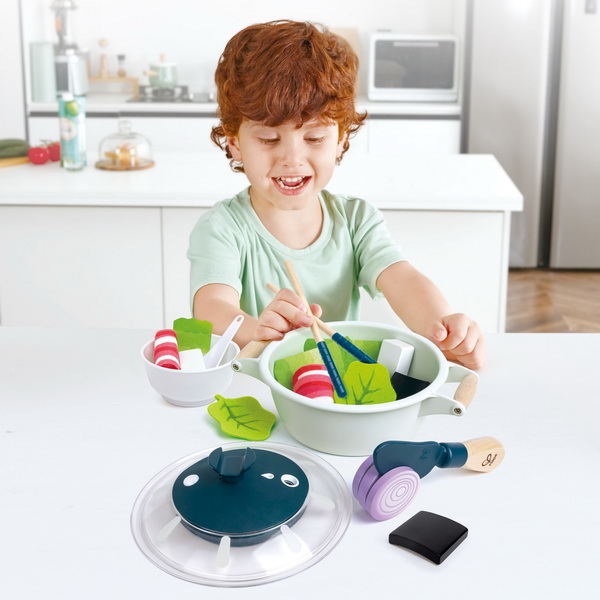Набор для приготовления пищи в кастрюле с реалистичным звуком и эффектом водяного пара. Включает в себя: одну кастрюлю с крышкой, одну ложку, один нож, два листа салата, одну луковицу, один кусок тофу, три говяжьих рулета, одну пару палочек для еды, три кусочка нарезанной капусты, два кусочка морских водорослей и одну маленькую миску. Нажмите кнопку на крышке, чтобы услышать звуковые эффекты приготовления пищи. Добавьте несколько капель воды. Через 10-15 секунд вы увидите, как поднимается прохладный туман, как настоящий пар.