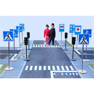 - Светофор (4 шт). Включает как пешеходный, так и транспортный; работает от аккумуляторной батареи; обладает всеми функциями настоящего светофора; имеет два режима переключения – механический и автоматический.