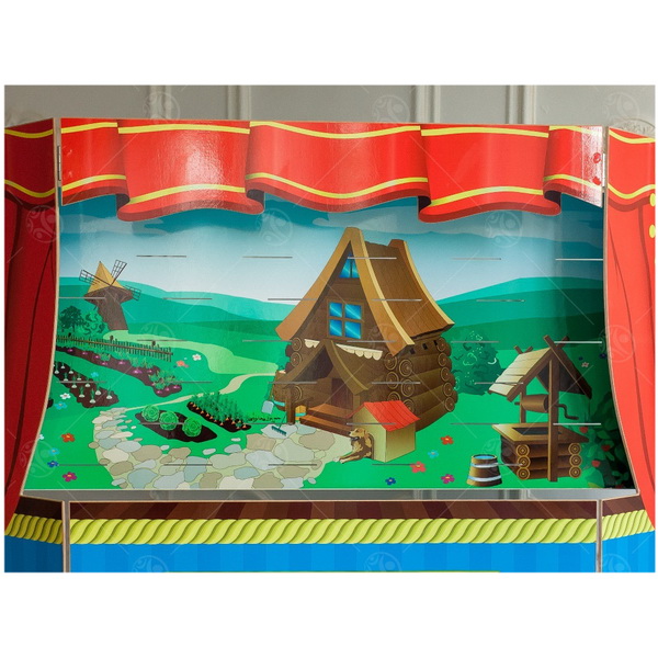 Двухсторонний экран для кукольного театра зима-деревня можно приобрести в дополнение к напольному кукольному театру. Экран имеет отверстия которые позволяют актеру наблюдать за своими куклами и зрителями при показе представления. С одной стороны, на экране изображен деревенский домик с огородом, колодцем и мельницей, а на другой стороне зимний пейзаж с домиком и мостиком.