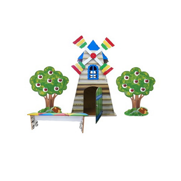 - декорация Мельница-дом (сняв лопасти, Вы получаете универсальный дом или башню). Дверь открывается, внутрь декорации может легко поместиться ребенок дошкольного возраста.