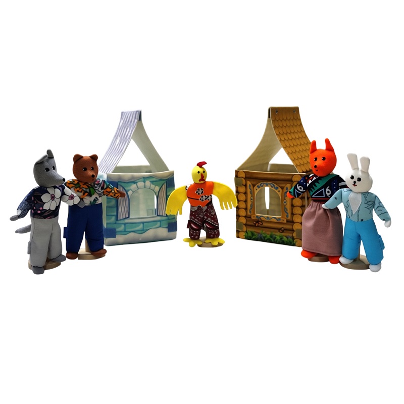 Перед вами – шагающий театр Заюшкина избушка, в который входят следующие персонажи: заяц, медведь, петух, волк, лиса, а также 2 разборных мягких домика из фетра (ледяной и лубяной), которые вы сможете использовать не только в игре, а также для хранения и переноски персонажей.
